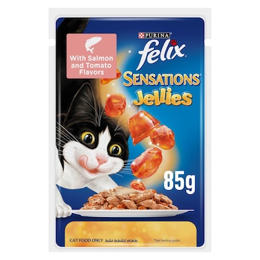 - Purina Felix Sensations Jellies Salmon And Tomato Cat Food with a delectable blend of salmon and tomato in a jelly texture.