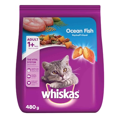 - <ul></li>VITAL SYSTEM TARGETING: A perfect balance between Omega 3 from Ocean Fish, carbohydrates, water, fat, zinc, and vitamins. promotes cognitive development. Made with all natural ingredients to keep your feline friend living a healthy lifestyle. </li></li>PERFECTLY CATERED FOR ADULT CATS: Whiskas Ocean Fish dry food is a nutritionally complete and balanced recipe that has carefully been created to cater to the requirements of an adult cat’s system.</li></li>GLOWING SOFT FUR: Whiskas provides the needed high-quality diet to maintain their shiny coats. Our formulas are complete with all the amino acids needed by cats to form healthy skin and hair cells. Ensures your cat always has a healthy glowing pretty fur.</li></li>CONVENIENCE FOR OWNERS AND CATS: Whiskas is convenient to keep and store once opened, due to its longer shelf life. Your cat will also find convenience in eating measured smaller volumes which is helpful for those that prefer to graze throughout the day.</li></li>AAFCO CERTIFIED: Formulated specifically to meet the right nutritional levels established by the AAFCO cat food nutrient profiles for adult maintenance for a complete & balanced meal all in the Ocean Fish flavored kibbles for your fluffy feline friends!</li><ul>