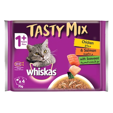 - <ul></li>VARIETY OF INGREDIENTS: Offer your adult cat tasty and high-quality chicken and salmon with protein and omega 3, together with nutrition from seaweed prepared in delicious gravy sauce that they will lick clean. </li></li> COMPLETE AND BALANCED NUTRITION FOR CATS: The recipe provides nourishment and makes mealtimes more exciting. It is made with 41 nutrients to boost you cat’s health and energy and Omega fatty acids to support healthy skin and coat. </li></li>RICH IN FLAVORS: Whiskas offers a tasty flavor for 1+ years adult cats, made with real fish as well as nutritious vegetables and includes all the enticing flavors that cats love.</li></li>100% NATURAL: Tasty Mix cat food recipe is carefully prepared with high quality ingredients and is made from real fish, easily digestible, that tastes delicious with no artificial.</li></li>IDEAL FOR ALL ADULT CATS: Whiskas appetizing texture, aroma and flavor will appeal even fussy eaters for a fun and filling mealtime. Your cat will love it and enjoy it 10 times more! </li><ul>