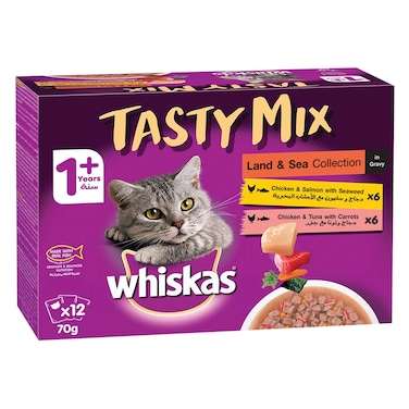 - <ul></li>WHISKAS TASTY MIX, MIX LAND AND SEA COLLECTION IN GRAVY: It consists of a mix of 12 pouches of cat wet food, 6 of land flavor, and 6 of sea. 70g each: 6 pouches of chicken and salmon with seaweed, and 6 pouches of chicken and tuna with carrots. </li></li> COMPLETE AND BALANCED NUTRITION FOR CATS: The recipe provides nourishment and makes mealtimes more exciting. It is made with 41 nutrients to boost your cat’s health and energy and beneficial proteins to support their health. </li></li>RICH IN FLAVORS: Whiskas offers a tasty flavor for 1+ years adult cats, made with real fish as well as nutritious vegetables and includes all the enticing flavors that cats love.</li></li>100% NATURAL: Tasty Mix cat food recipe is carefully prepared with high quality ingredients and is made from real fish mixed with chicken and vegetables, easily digestible, that tastes delicious with no artificial.</li></li>IDEAL FOR ALL ADULT CATS: Whiskas appetizing texture, aroma and flavor will appeal even fussy eaters for a fun and filling mealtime. Your cat will love it and enjoy it 10 times more! </li><ul>
