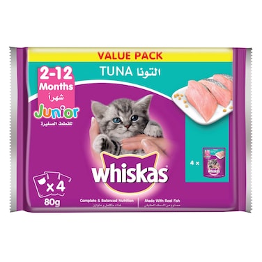 - <ul></li>85% MOISTURE CRAFTED FOR KITTENS: Whiskas Junior Kittens pouch includes 85% moisture which is extremely important for the digestive tract, for the proper digestion and breakdown of food nutrients, that helps prevent kitten dehydration. </li></li> REAL TUNA CHUNKS: Each pouch of Whiskas Junior Kittens contains gently cooked, succulent chunks of Tuna, carefully prepared with all the essential nutrients your little one needs to help them grow big and strong. </li></li>AAFCO CERTIFIED: Whiskas Junior Kittens pouch Tuna is formulated to meet the nutritional levels established by the AAFCO cat food nutrient profiles for growth and maintenance so you won't have to worry about your kitty's healthy growth. </li></li>TEMPTING AROMA AND FLAVOR: For cats, It's all about the aroma! let your feline friends indulge in the tempting scents and flavors with these Whiskas Junior pouches, which are effective to attract all fussy eaters! </li></li>CAN BE USED AS TREATS: This Whiskas Junior Kittens Tuna meal, which is conveniently easy to nibble on and to digest, can be given to baby cats as treats as well, to reward them for good kitty behavior! </li><ul>