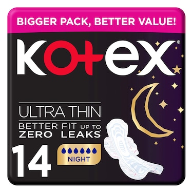 Kotex Ultra Thin Pads, Overnight Protection Sanitary Pads with Wings, 14 Sanitary Pads
