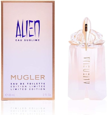 Alien Eau Sublime, announced as an energetic, luminous and comfortable scent, opens with a combination of lemon, orange, mandarin, galbanum and solar flowers. Jasmine in the heart is complemented by cherry blossom, tiare flower and heliotrope, while in the base cashmere is joined by woody vetiver and white amber.